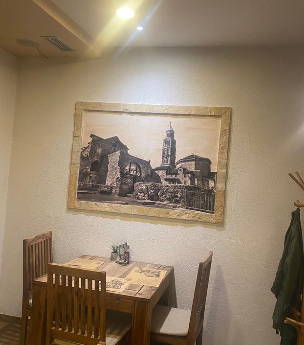 Ime je inspirirano likom iz serije “Naše malo misto”, a atmosfera pizzerije potpuno je u tom tonu. Zidovi ukrašeni starim dalmatinskim detaljima, miris krušne peći, topla riječ osoblja i naravno vatra koja sve povezuje.