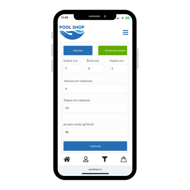 Prvi i najvažniji korak u održavanju bazenske vode je pravilno reguliranje pH vrijednosti. Optimalna pH vrijednost vode treba biti između 7.0 i 7.6, dok je idealna vrijednost između 7.2 i 7.4. Ovaj raspon omogućuje svim sredstvima za njegu bazenske vode da postignu svoj maksimalni učinak uz minimalnu potrošnju. Previsok pH smanjuje učinkovitost drugih kemijskih proizvoda i može izazvati iritaciju očiju i kože. Nizak pH može uzrokovati koroziju metalnih dijelova i nagrizanje površina. Poolshop.hr nudi besplatan pH kalkulator kako bi vam olakšao postizanje optimalne ravnoteže u vodi.