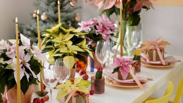 Blagdanski aranžman: mini božićne zvijezde u ukrašenoj zdjeli