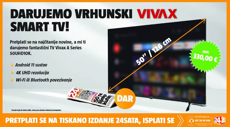 24sata donosi sjajne pogodnosti za vjerne pretplatnike. Postanite pretplatnik, a mi vam darujemo vrhunski VIVAX SMART TV 50''/ 126 cm. Pretplatiti se možete na linku.