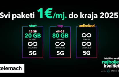Riječ je o aktualnoj ponudi u kojoj Telemach novim korisnicima na raspolaganje daje sve mobilne tarife za svega 1 euro mjesečno do kraja godine, uz ugovor na 24 mjeseca. Razlog za slavlje imaju i postojeći korisnici jer im operator potpuno besplatno povećava količinu gigabajta u paketima: svi korisnici START paketa za korištenje odsad imaju 20 GB, a TOP paketa čak 80 GB.