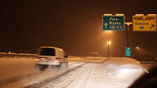 Vrlo gusti snijeg intenzivno pada te znatno otežava promet od Zagreba prema Primorju, a u Gorskom kotaru prijeti slabom prometu koji se ipak odvija unatoč ugaženom snijegu na kolniku kojeg ralice ne uspijevaju očistiti i izrazito smanjenoj vidljivosti. S primorske strane tunela Tuhobić, bura znatno otežava promet, a snijeg pada do Grobničkog polja. Dojavio nam je to Marijan Kavran koji je snimio fotografije u petak oko 21 sat na autocesti A6, Rijeka-Zagreb.