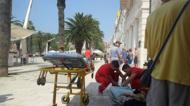 Na splitskoj rivi žena je u petak ujutro pala preko nogu turista koji su ležali naokolo. Prvi joj je u pomoć priskočio konobar Boško. Stavljao joj je hladne obloge po vratu