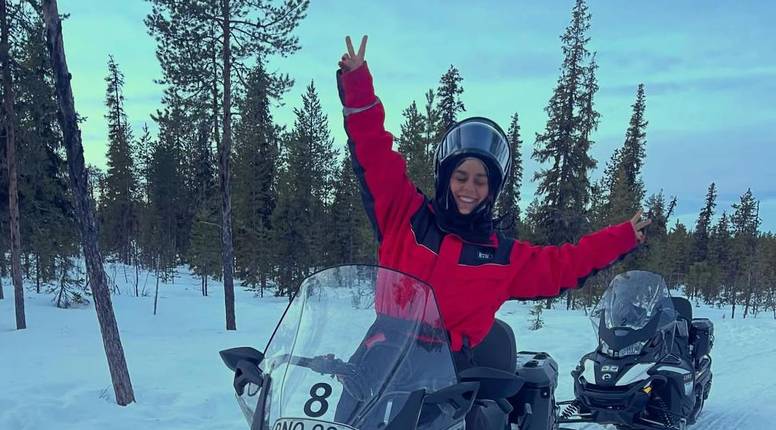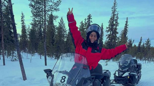 Glumica je uživala u skandinavskom krajoliku, a vozila se snježnim motorom kroz šumu i preko zaleđene rijeke. Na kraju se okrijepila u kolibi uz topli čaj.