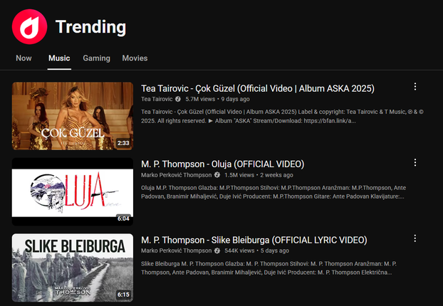 U top 5 nalaze se još dvije pjesme Tee Tairović, što sugerira da Hrvati ovih dana najviše slušaju upravo nju, a ona je tijekom proteklog vikenda nastupila u Areni Zagreb. Kada je riječ o općem YouTube trendingu, prvo mjesto i dalje drži Thompson sa 'Slikama Bleiburga', slijedi Marko Bošnjak sa svojim eurovizijskim nastupom, dok je na trećem mjestu ponovno Thompson s pjesmom 'Oluja'.