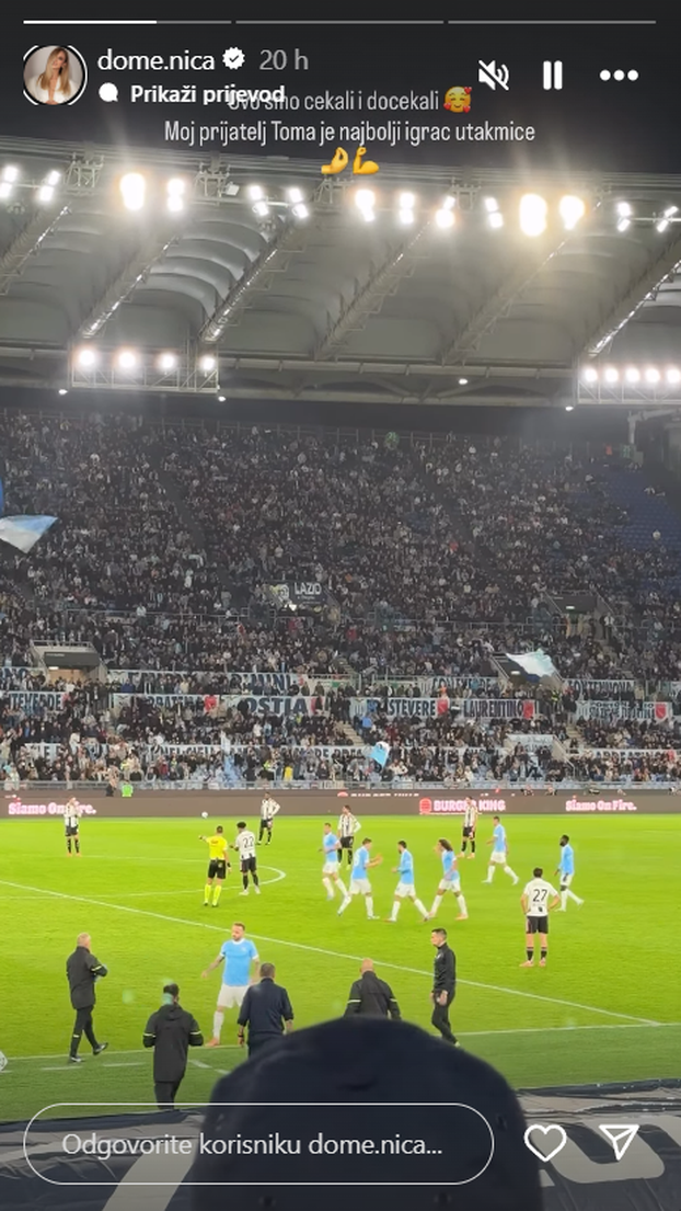 Domenica Žuvela iznenadila je brojne obožavatelje na društvenim mrežama. Na svojem Instagram profilu pjevačica je podijelila fotografije s mjesta na kojem je se ne može vidjeti baš često. Naime, pohvalila se kako prati susret između Lazija i Juventusa, u kojem je veliku pobjedu izborio rimski klub pogotkom hrvatskog nogometaša Tome Bašića.