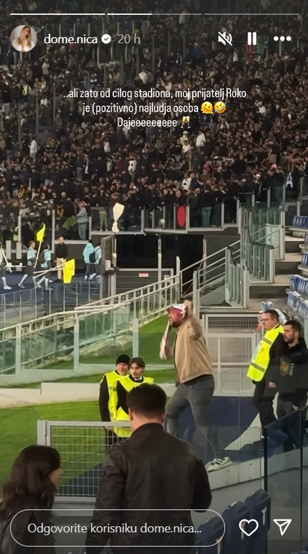 - Ali zato od cijelog stadiona, moj prijatelj Roko je najluđa osoba. Dajeee - dodala je pjevačica, našalivši se na račun prijatelja Roka, koji je samouvjereno i ponosno istaknuo šal onoga koji, kako se to kaže, živi vječno, odnosno splitskog Hajduka.