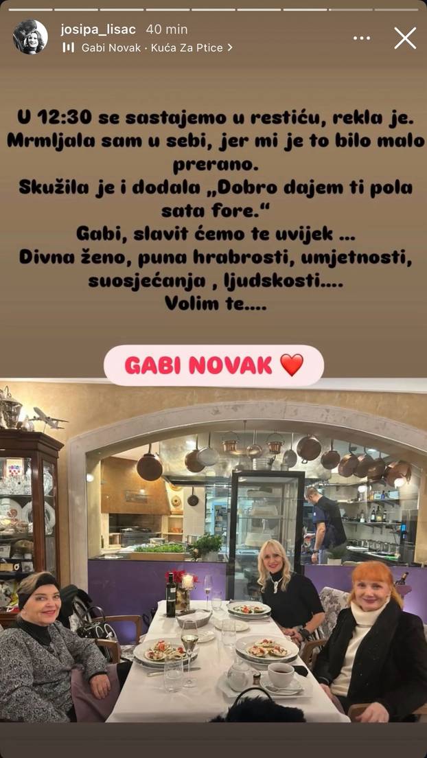 - U 12:30 se sastajemo u restiću, rekla je. Mrmljala sam u sebi, jer mi je to bilo malo prerano. Skužila je i dodala 'Dobro, dajem ti pola sata fore'. Gabi, slavit ćemo te uvijek... Divna ženo, puna hrabrosti, umjetnosti, suosjećanja, ljudskosti. Volim te... - napisala je Josipa na Instagramu i uz objavu pridružila pjesmu 'Kuća za ptice'.