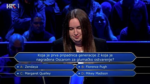 Komentari 1Josipa je napustila igru odgovorivši pogrešno na 11. pitanje za 10.000 eura. Na pitanje koja je prva pripadnica generacije Z koja je nagrađena Oscarom za glumačko ostvarenje, odlučila se za odgovor A
