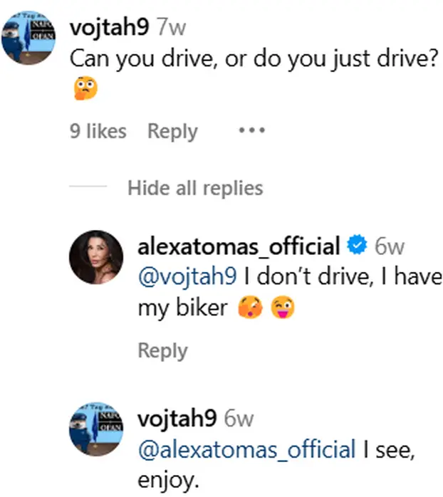 Komentari 5Alexa Tomas je podijelila fotografiju pored motora, na što joj je Antonio komentirao: 'Drugi level baby, čekamo treći'. Ona mu je odgovorila: 'Da, da, da! Imamo sve vrijeme svijeta sad'