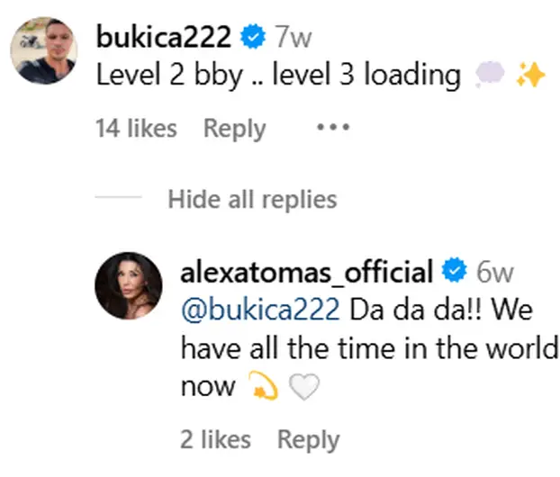 Da su nešto više od prijatelja, može se naslutiti iz njihovih objava na društvenim mrežama. Alexa je podijelila fotografiju pored motora, na što joj je Antonio nedavno komentirao: 'Drugi level baby, čekamo treći'. Ona mu je odgovorila: 'Da, da, da! Imamo sve vrijeme svijeta sad.'