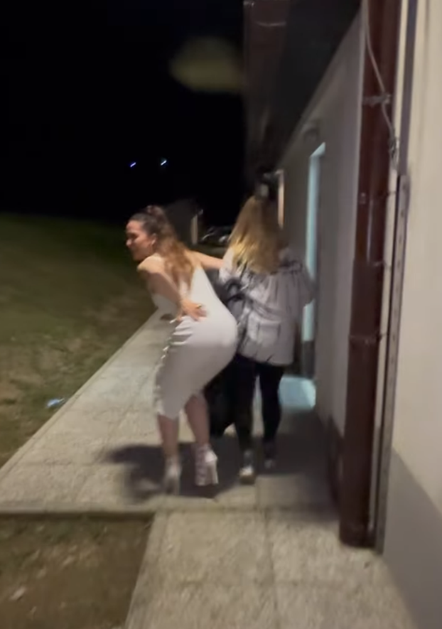 Na prvoj je pozirala u dugačkoj bijeloj haljini s prorezima i bijelim štiklama uoči nastupa, a na zadnje dvije je pokazala kako joj prijateljica pomaže dok hoda s nastupa te žuljeve na nogama od cijele večeri plesanja u neudobnim štiklama.