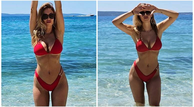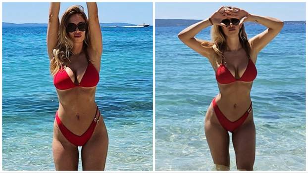 Preplanula Lidija uskočila je u crveni kupaći kostim koji je istaknuo njezine bujne obline i pozirala u moru