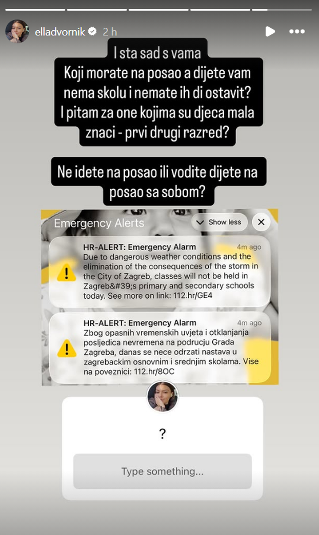 Situaciju u Zagrebu je komentirala i influencerica Ella Dvornik. Ona je upitala svoje pratitelje, koji imaju djecu školarce, što će napraviti obzirom da je nastava otkazana.