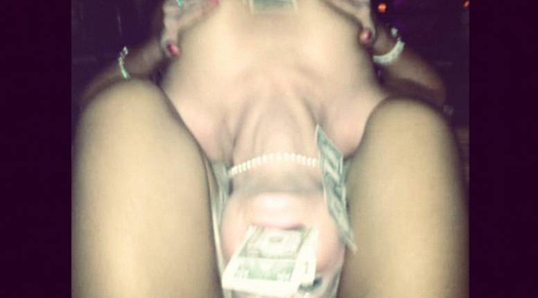 Pjevačica je na Twitteru objavila fotografiju na kojoj joj striptizeta drži glavu između bedara. Striptizeta je u toplesu  i rukama pokriva grudi, a cijelo tijelo posuto joj je novčanicama.