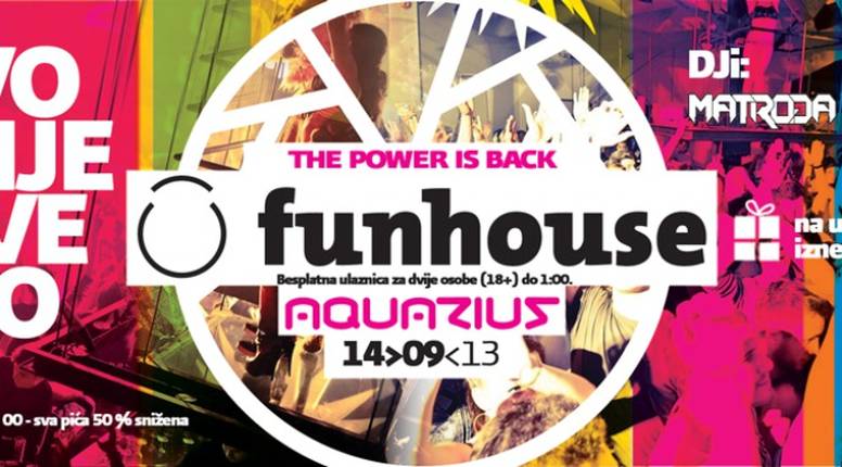 Dobre stvari vrijedi čuvati, obnavljati, usavršavati i prezentirati u sasvim novom svjetlu. Upravo to se događa s vodećim vikend-programom hrvatske metropole u blistavom izdanju dotjeranog i zvukom unaprijeđenog kluba Aquarius na Jarunu. Nova sezona partijanja počinje u subotu, 14. rujna 2013.; ne propustite povratak vodeće glazbene sile u regiji. Da, Funhouse se vraća... THE POWER IS Funhouse je upravo ono što i sam naziv govori. To je program u kojem se klub Aquarius pretvara u kuću odnosno "dom zabave" za sve prisutne. Tko je samo jednom proveo noć na Funhouse-u, nije se vratio kući isti. Generacije će zasigurno prepričavati o doživljajima koje su tamo proživjeli kada je cijela uhodana Funhouse ekipa prenijela atmosfere klubova New Yorka kao i europskih prijestolnica na podije kluba Aquarius u Zagrebu, pa još i dotjerala cijeli dojam večeri.