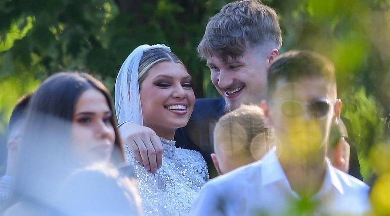 Za večernji dio proslave i civilnu ceremoniju, mladenka se presvukla u potpuno drugačiju, svjetlucavu kreaciju. Raskošna haljina dugih rukava, bogato posuta šljokicama i s visokim prorezom, naglasila je njezinu siluetu, a kosu je podignula u elegantan rep. Uz nju je cijelo vrijeme bila kuma Petra Kljajić, kći proslavljenog rukometaša Nenada Kljajića.