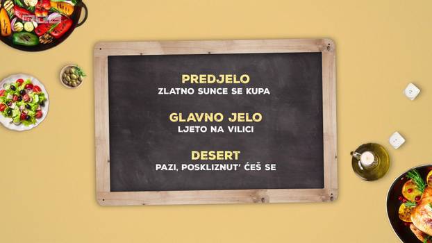Za svoje goste Mijo će pripremiti predjelo naziva 'Zlatno sunce se kupa', glavno jelo 'Ljetno na vilici' i desert 'Pazi, poskliznut' ćeš se'...