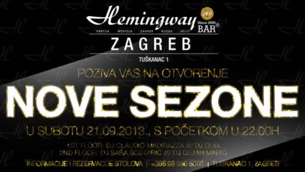 Kultno okupljalište ljubitelja noćnog života i dobre zabave, Hemingway bar Zagreb na Tuškancu, u subotu 21. rujna otvara novu sezonu na radost brojnih partyjanera i svih željnih izlazaka u samom srcu grada Zagreba. U prošloj je sezoni Hemingway bar pokazao svoje novo lice nakon preuređenja i proslavio 10. rođendan, a u sezoni 2013./2014. najavljuje bogat i kreativan programski sadržaj, još više resident DJ-a koji će Vas svojim izborom glazbe uveseljavati do ranih jutarnjih sati tijekom čitave sezone, predivne hostese "Hemingway Ladies" koje će Vas dočekat na početku svake večeri, a i neki zanimljivi gostujući izvođači i programi.