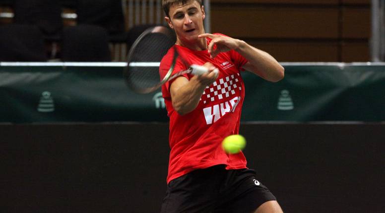 Komentari 1Duje Ajduković, debitant u hrvatskom sastavu u Davis Cupu, za sada je najzaposleniji član reprezentacije u Splitu. U očekivanju da se ekipa kompletira on je do sada dobio najveću minutažu na treningu u velikoj dvorani na Gripama, u petak mu je sparing partner bio Josip Šimundža, a u subotu ujutro Luka Mikrut, koji je ni 24 sata prije toga s Milijem Poljičkom osvojio naslov u konkurenciji parova na turniru iz kalendara ITF World Tennis Toura u Mariboru.