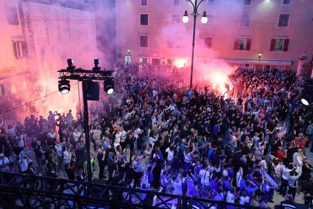 Na Narodnom trgu igrače su dočekali župan Zadarske županije Josip Bilaver, gradonačelnik Šime Erlić, brojni sportski djelatnici i uzvanici, kao i direktor KK Zadar Roko Jurlina, jedan od ključnih inicijatora obilježavanja ove velike obljetnice. Program su vodili Danijela Đimoti, Ivica Štorić i Igor Jelenić Toto, razgovarajući s članovima slavne generacije, a svaki njihov izlazak na pozornicu bio je nagrađen velikim pljeskom. Igrače je pak prozivao legendarni Zdenko Perić.