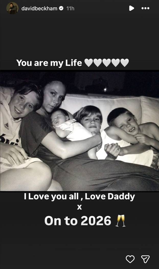 Iako je u prvoj objavi sažeo svoju "nezaboravnu" 2025. bez spominjanja najstarijeg sina, u kojoj je proslavio 50. rođendan i dobio vitešku titulu, David je samo nekoliko sati kasnije promijenio ton. Na Instagramu je podijelio staru fotografiju s mladim Brooklynom uz poruku "Sve vas toliko volim", a zatim i sliku supruge Victorije s četvero djece uz koju je napisao: "Vi ste moj život". Dirljivu je gestu završio riječima: "Sve vas volim, voli vas tata", a Victoria je sve podržala podijelivši objavu sa srcem.