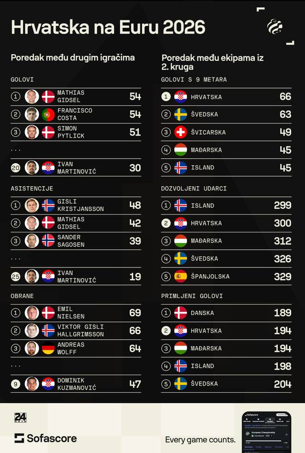 Što se toga tiče, najbolji hrvatski asistent je opet Ivan Martinović koji je skupio 19 asistencija i time je na 25. mjestu ukupne liste. Dakle, opet jako daleko od vrha. Tin Lučin drugi je najbolji asistent Hrvatske i to mu je osiguralo 33. mjesto. Najviše asistencija na Euru Islanđanin Gisli Kristjansson koji je stao na brojci 48, a iza njega je Gidsel sa 42 dodavanja za gol.