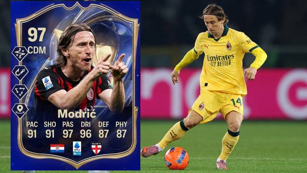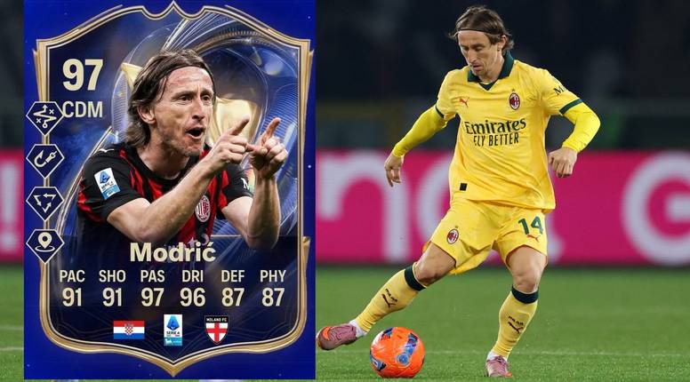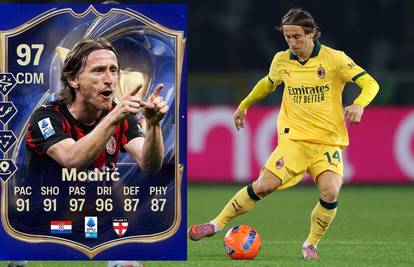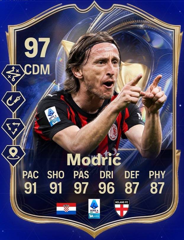 Dvije riječi - Luka Modrić (40)! Njegova monstruozna kartica nalazi se u momčadi sezone Serie A te će imati nevjerojatne ocjene. Ocjene idu do 99, a kapetan hrvatske reprezentacije ima ukupnu ocjenu 97 uz brzinu 91, šut 91, dribling 97, obranu 87 i snagu 87.