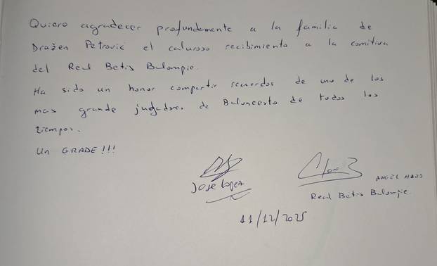 - Želim duboko zahvaliti obitelji Dražena Petrovića na toplom dočeku izaslanstva Real Betisa Balompié. Bila je čast dijeliti uspomene na jednog od najvećih košarkaša svih vremena. Jedan VELIKI!!! - napisao je Haro u knjigu sjećanja uz datum posjete i svoj potpis.