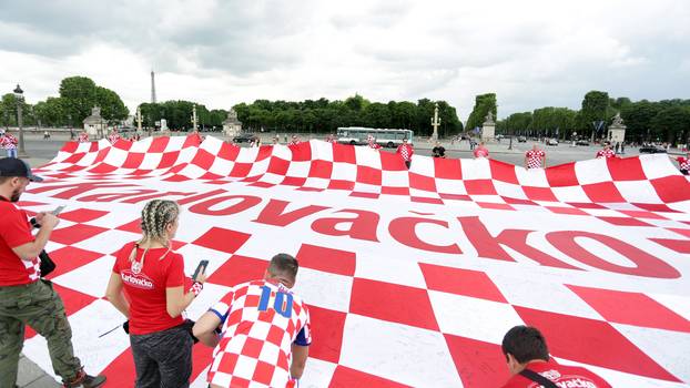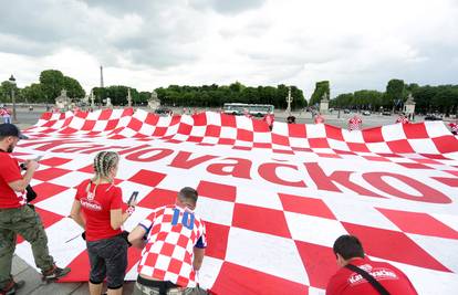 Razvili su i veliku navijačku zastavu Karlovačkog u centru Pariza. Duga je čak 30 metara, a na njoj su potpisi tisuća hrvatskih navijača. Zapjevali su “Mi Hrvati, mi Hrvati”, a svi su oduševljeno pozdravljali navijače u crveno-bijelim “kockicama”.