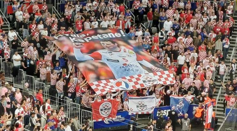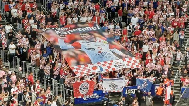 U petoj minuti na tribinama je podignut transparent posvećen kapetanu Domagoju Duvnjaku. Utakmica protiv Francuske bit će njegova posljednja u najdražem dresu pred domaćom publikom