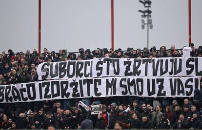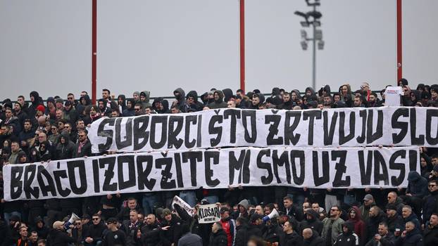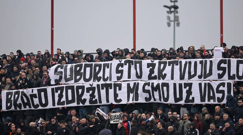 "Suborci što žrtvuju slobodu, izdržite braćo, mi smo uz vas", napisala je Torcida na velikom transparentu, a onda i pjesmom "O Zvezdo zvezdana, ti ku*** je****, je*** te Velež, je**** te svi, a najviše Splićani" nastavila obračun sa srpskim klubom i njihovim navijačima.