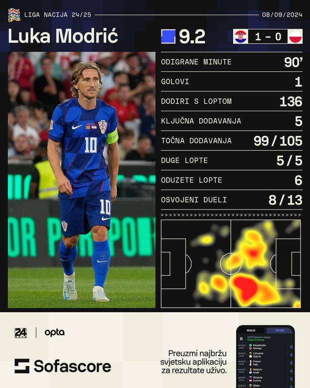 Luka Modrić poveo je Hrvatsku do pobjede (1-0) protiv Poljske u 2. kolu Lige nacija na Opus Areni. Kapetan "vatrenih" odigrao je još jednu čudesnu utakmicu i fantastičnim izdanjem proslavio 39. rođendan (9. rujna).