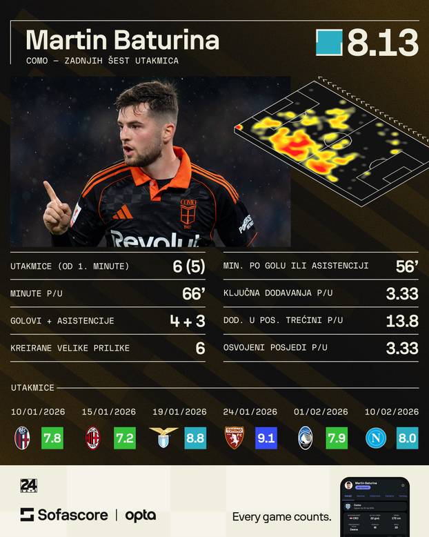 A onda je stigla 2026.i potpuni preokret. Baturina je eksplodirao. U posljednjih šest utakmica zabio je čak četiri gola i triput asistirao, postavši ključni igrač Coma. Niz je započeo golom protiv Bologne, nastavio asistencijom protiv Milana, a zatim je srušio Lazio i Torino uz gol i asistenciju. Vrhunac je stigao na stadionu Diego Armando Maradona, gdje je prvo zabio za 1-1, a zatim i u raspucavanju penala za povijesni trijumf.