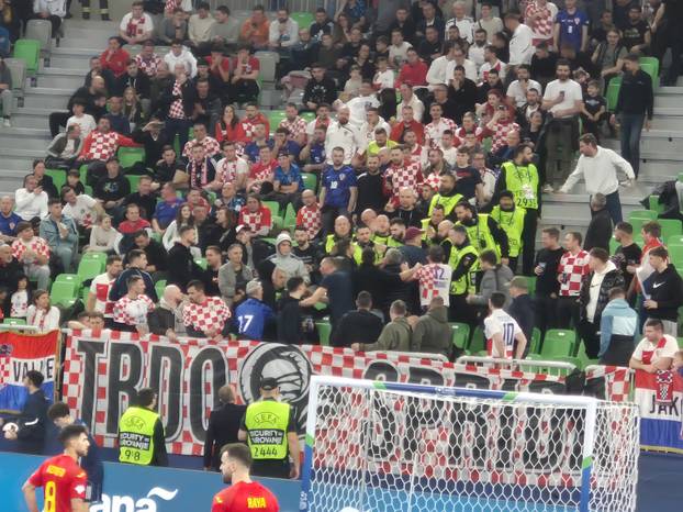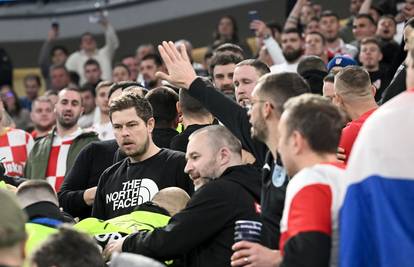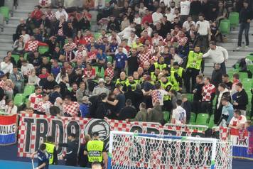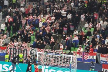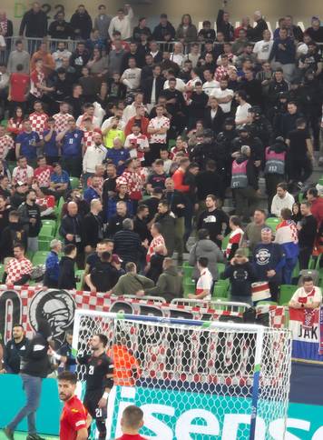 Napeta situacija na terenu odrazila se i na atmosferu na tribinama. Dio hrvatskih navijača burno je reagirao na sudačke odluke, bacali su čaše na parkeT