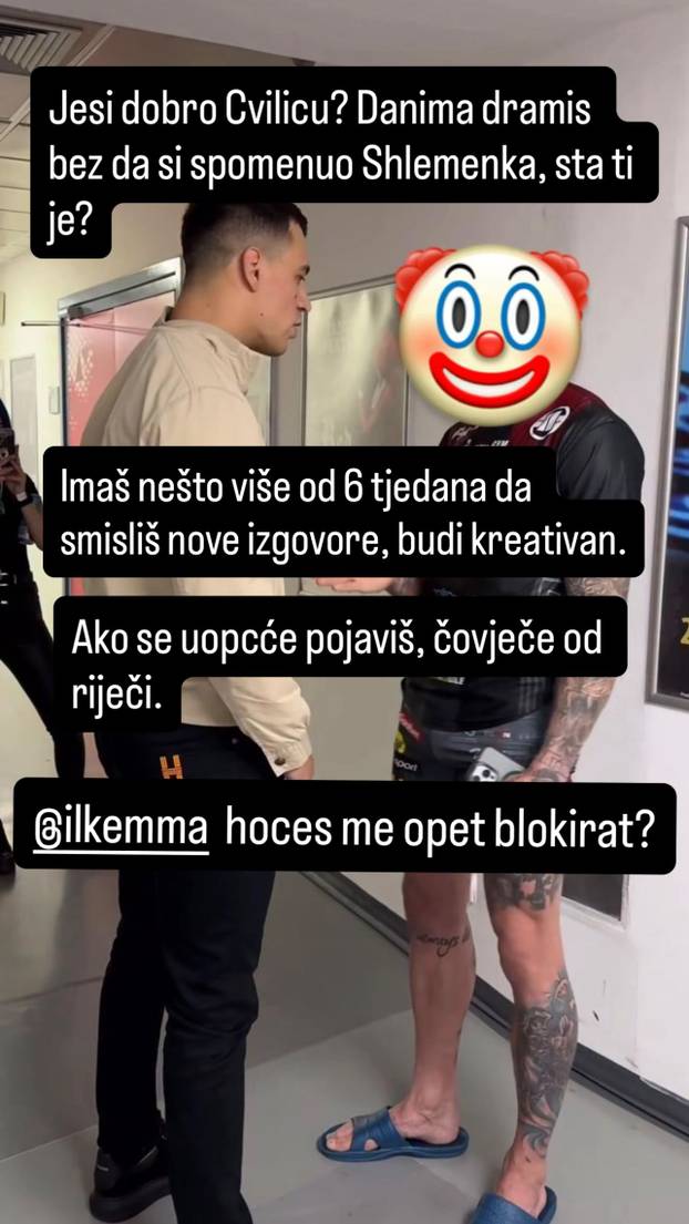 "Jesi dobro, Cviliću? Danima dramiš bez da si spomenuo Šlemenka, što ti je? Imaš više od šest tjedana da smisliš nove izgovore, budi kreativan. Ako se uopće pojaviš, čovječe od riječi", napisao je Barbir i dodao video u kojemu o njemu govori Ilićev trener Ivan ‘Icko’ Đorđević.