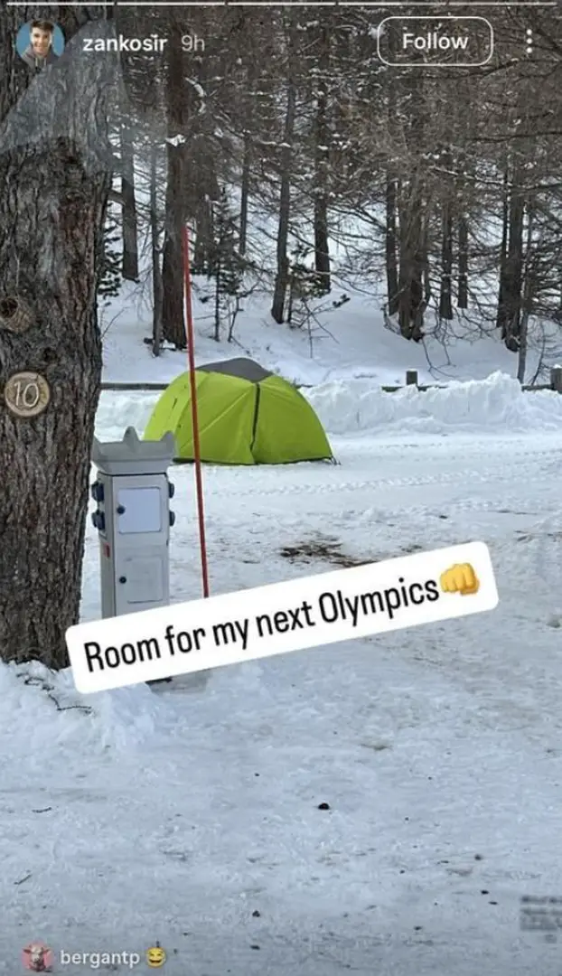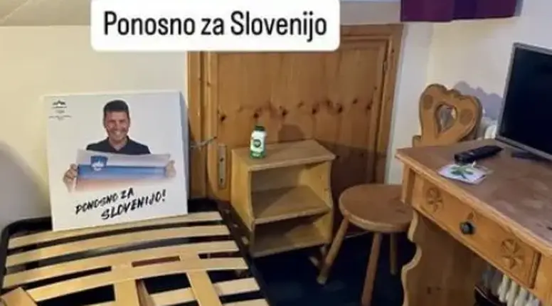 Sliku je popratio sarkastičnim natpisom: "Ponosno za Sloveniju", nakon čega je uslijedilo i retoričko pitanje: "A što Slovenija za mene?". Ubrzo je dodao i fotografiju malenog šatora pod vedrim nebom, uz šalu kako će mu to vjerojatno biti smještaj na idućim Igrama.