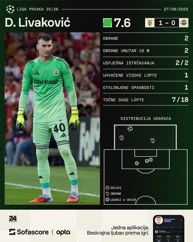 Na koncu je presudio pogodak Kerema Aktürkoglua u 36. minuti, no dojam je bio jasan: da nije bilo Livakovića na golu, Fenerbahče bi doživio rezultatski potop. U momčadi koja, prema Mourinhovom vlastitom priznanju nakon utakmice, nije bila na razini protivnika, Livaković je jedini igrao na razini Lige prvaka.