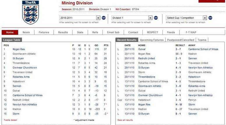 Illogan Royal British Legion Reserves klub je koji očito misli ozbiljno, nakon 13. kola prvi su na tablici, a igrali su protiv posljednjeg Madrona. Navijači na tribinama su vjerojatno pomislili da gledaju Barcelonu ili Real Madrid, s obzirom da su slabašnim gostima zabili 55 golova! Zbog nedostatka igrača (ne zna se zašto), igrali su samo sedam nogometaša. Golove je zabilo 11 različitih igrača, a najviše izvjesni Luke Abbott-Smith. Sa 10 golova sigurno je zainteresirao klubove iz jačih liga, šeste ili sedme možda...