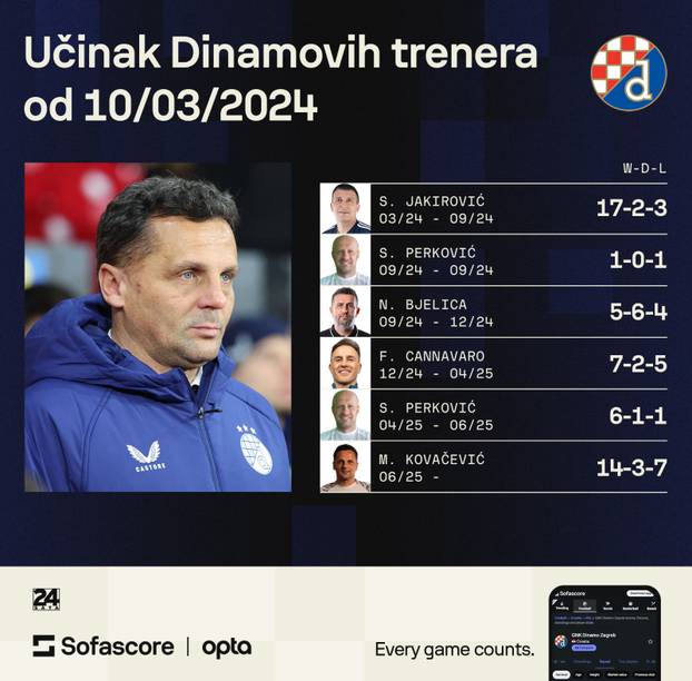 Naime, popularni Kova je preuzeo "modre" 4. lipnja 2025. i vodio ih je u 24 utakmice dosad. Pobijedio je 14 dvoboja, tri remizirao i sedam ih izgubio. Prosječno osvaja 1,88 bodova po utakmici.
