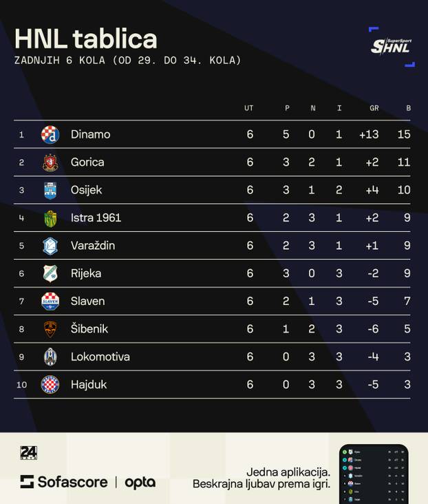 U istom je razdoblju Gorica druga najbolja momčad lige s jednim porazom i 11 bodova u šest utakmica, Osijek je treći, Rijeka tek šesta s po tri pobjede i poraza, a na dnu je najveće razočaranje proljetnog dijela sezone, Hajduk. Koji je i dalje teoretski u igri za naslov, ali će mu za to trebati pravo malo čudo.