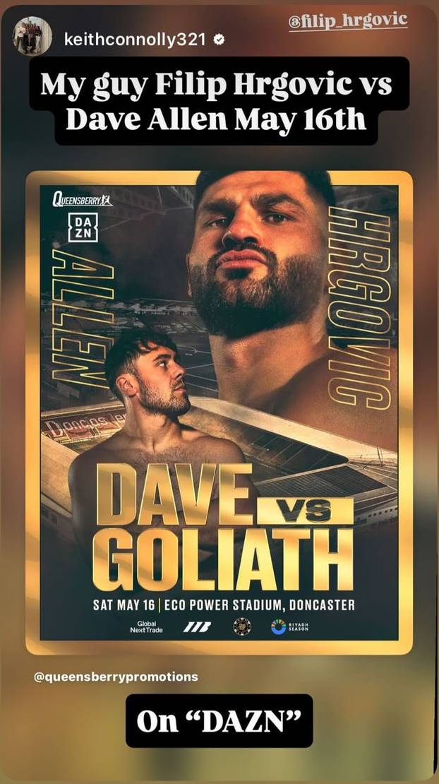​- Dan 16. svibnja bit će čarobno iskustvo za Davea Allena. Bori se protiv operatera svjetske klase u Filipu Hrgoviću, ali to može učiniti na vlastitom pragu, na stadionu Doncaster Roversa (engleski trećeligaš, op.a.) - poručio je Warren.