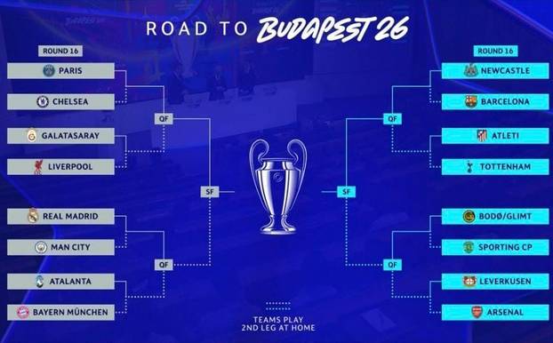 U osmini finala sastaju se Real Madrid i Manchester City, Bodo/Glimt i Sporting, PSG i Chelsea, Newcastle i Barcelona, Galatasaray i Liverpool, Atletico Madrid i Tottenham, Atalanta i Bayern te Bayer Leverkusen i Arsenal.