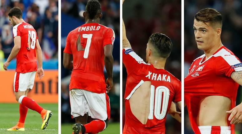 Prije svega to se odnosi na švicarsku reprezentaciju čiji su igrači čak četiri puta morali mijenjati dresove. Redom su majice pucale Xhaki dvaput, te po jednom Mehmediju i Embolu. A kad je u 53. minuti pukla i službena lopta Europskog prvenstva mnogi su pomislili da je Švicarcima i Francuzima opremu nabavila popularna zvijezda Mućki Del Boy Trotter.