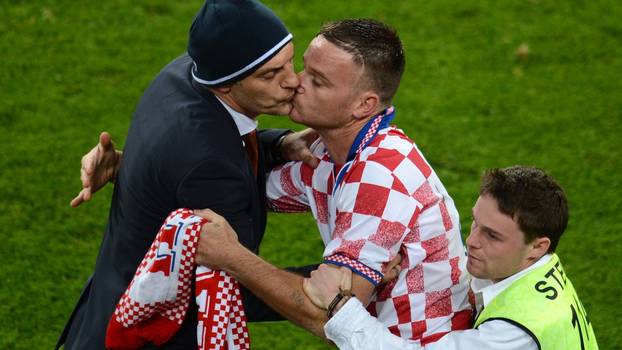 Na fenomenalnoj utakmici Hrvatske i Irske u poljskom Poznanju jedan hrvatski navijač je od radosti zbog 3:1 skočio s tribina, zaletio se do Bilića i poljubio ga