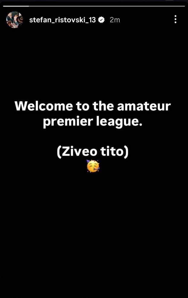 - Dobrodošli u amatersku Premijer ligu. Živio Tito - napisao je bivši makedonski reprezentativac. Ubrzo je izbrisao objavu jer je shvatio da ga čeka teška kazna, ali bez obzira na to, nju neće izbjeći, disciplinski sudac neće biti blag prema njemu.