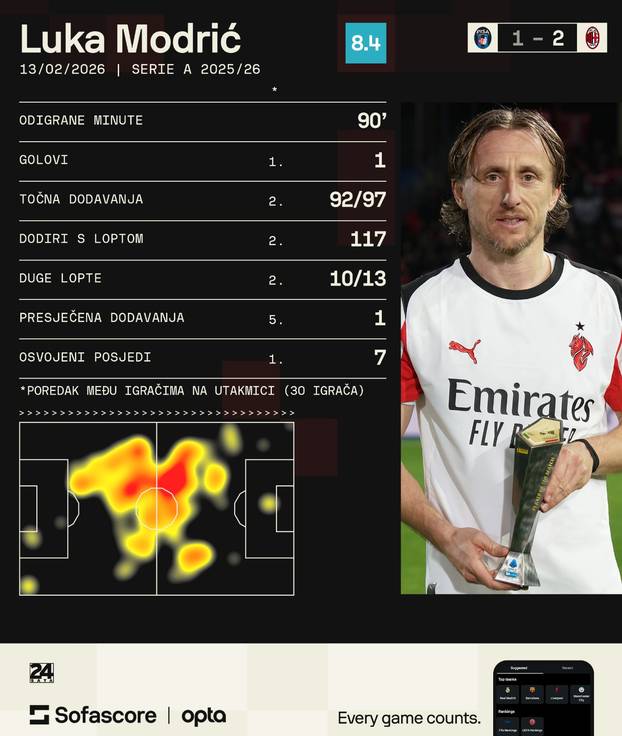 Milan je u 25. kolu Serie A pobijedio Pisu 2-1, a heroj utakmice bio je kapetan 'vatrenih' Luka Modrić koji je pogotkom na kraju susreta osvojio nova tri boda za 'rossonere' te smanjio zaostatak na ljestvici za Interom