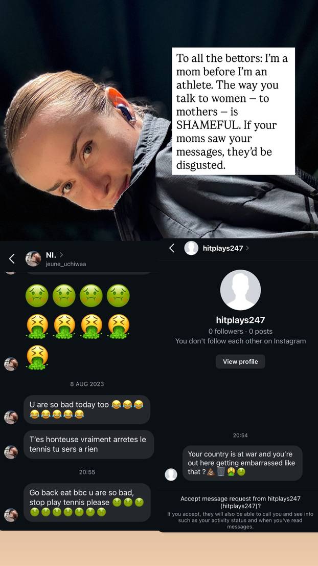 "Svim kockarima: Ja sam mama prije nego što sam sportašica", napisala je 30-godišnja Svitolina u Instagram profilu, priloživši snimke poruka koje su uključivale prijetnje smrću.