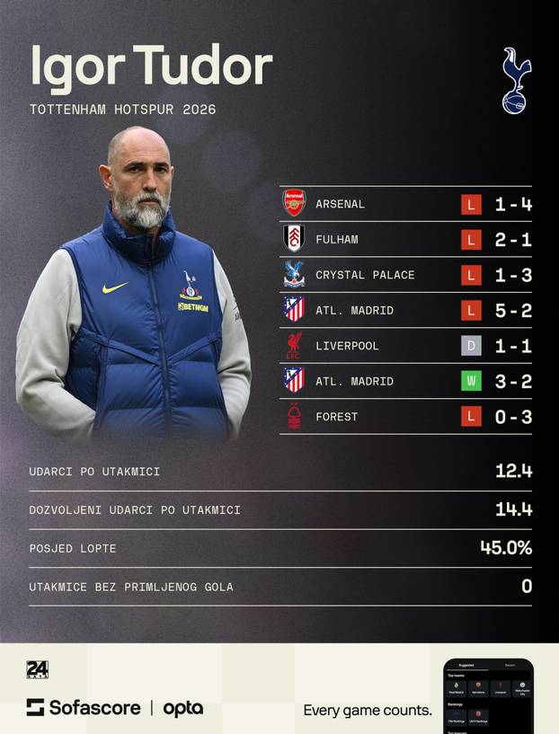 Podsjetimo, Tudor je sredinom veljače na klupi Spursa zamijenio Thomasa Franka, koji je prošlog ljeta zamijenio Australca Angea Postecoglua. Potonji je dobio otkaz nakon katastrofalne sezone u domaćim natjecanjima, iako je Spursima donio trofej Europske lige. Uprava Spursa istaknula je kako njihova ambicija nije borba za 17. mjesto u prvenstvu, ali sad je svima očito kako problem nije bio Postecoglu. Ni Frank. I da nije bio Tudor.