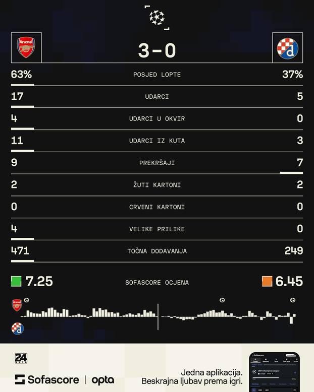 Na trenutak je zamirisalo na opasnost, kada je Pjaca sjajno i oštro ubacio u sredinu, ali Arsenalova obrana otklonila je opasnost. Uslijedio je novi ubačaj Bernauera, a zatim je Kačavenda izborio korner. Dinamo je pritisnuo na samom kraju utakmicu. Mrvicu prekasno.